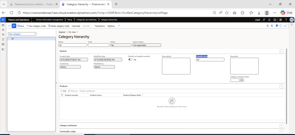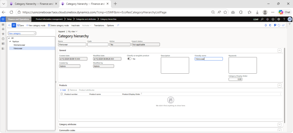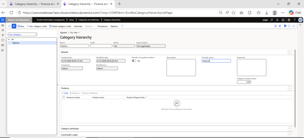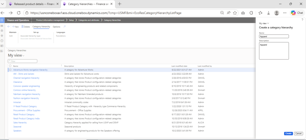 Navigate to Product Information Management > Setup > Categories and attributes > Category hierarchies > Click on New > Enter Name (Apperal) > Click on Create