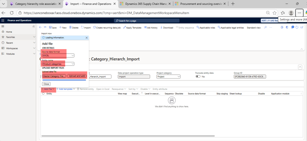 Click on Add file > Source data format (Excel) > Entity name (Product categories) > Choose the file (download sample file from below download section)